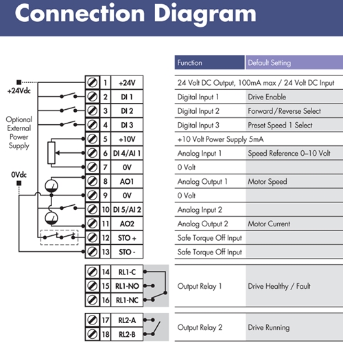 • "Selection of 8 functions from: RV(Reverse), CF-ICF-4(Multispeed command), JG(Jogging), DB(ExternaI DC braking)"