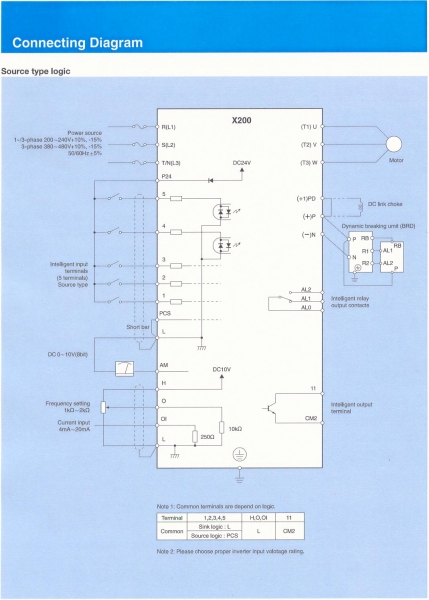 • "FW (Forward run command), RV (reverse run command, CF1~CF4 (multi-stage speed setting), JG (jogging command), 2CH (2-stage acceleration/deceleration command), FRS (free run stop command), EXT (external trip), USP (USP function), SFT (soft lock), AT (analog current input select signal), RS (reset), PTC (thermal protection)"